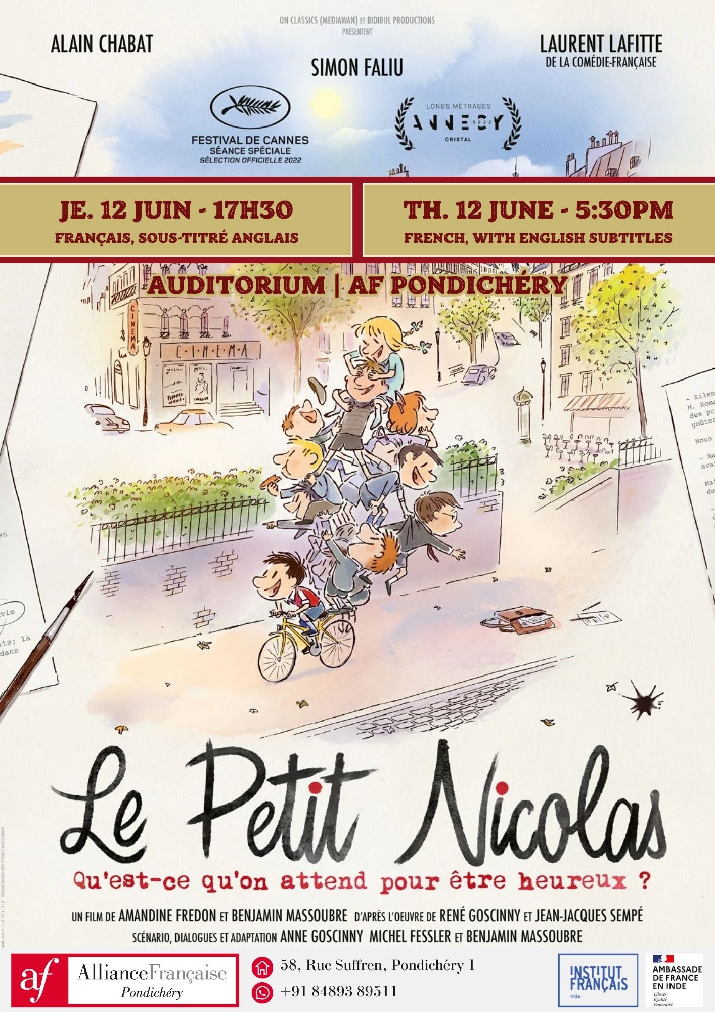 Screening – “Le Petit Nicolas : Qu’est-ce qu’on attend pour être heureux” Map Unavailable Date/Time Date(s) - 12/06/20255:30 pm - 9:00 pm Categories Events Screening 2022 ‧ Children/Comedy ‧ 1h 26m – French with English subtitles